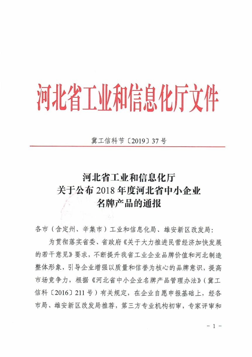 我公司獲評河北省中小企業(yè)名牌產(chǎn)品
